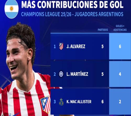 本赛季阿根廷球员欧冠参与进球榜:阿尔瓦雷斯6粒居首