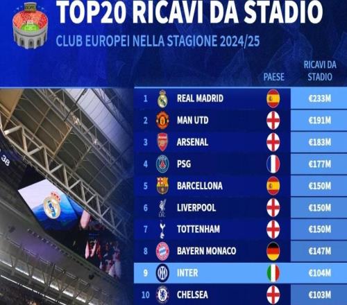 上赛季欧洲俱乐部门票收入:皇马2.33亿第1,曼联阿森纳二三位