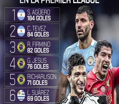 英超拉美球员射手榜:阿圭罗184球第1,希门尼斯63球升至第7