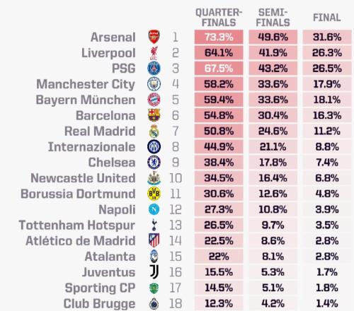 超算预测欧冠冠军:阿森纳最大热门,领先利物浦巴黎曼城