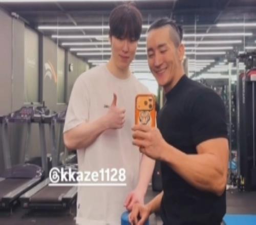 31号还在健身的三兄弟教练分享与KanaviGumayusi和zeka合照