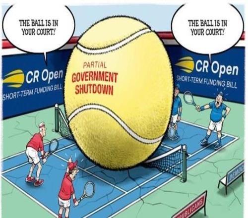参考消息网9月28日报道在“短期支出法案”公开赛的赛场内,“政府部分关门”的网球压在球场中间,代表美国两党...