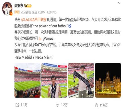 北京时间9月28日,马德里大都会球场,一场激烈的马德里德比正在上演,作为知名皇马球迷的樊振东更新了社媒,晒出自己现场观战马德里德比的照片,这是他第一次随皇马征战客场,“感谢西甲联赛的邀请,第一次随皇马征战客场,在大都会球场亲历德比的激烈碰撞。”樊振东在社交媒体上写道