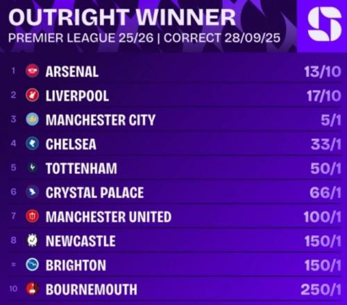 风向变了!英超最新夺冠赔率:阿森纳登顶,利物浦第2,曼联排第7
