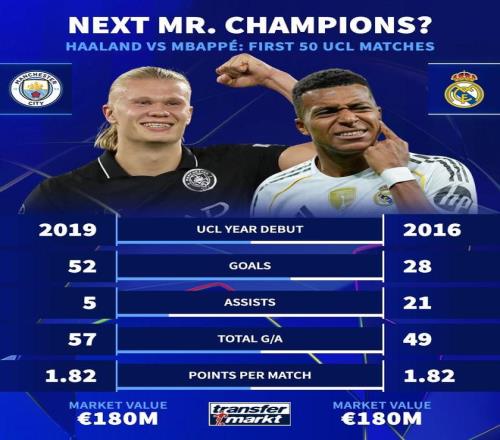 北京时间10月2日,德国转会市场统计了哈兰德与姆巴佩前50场欧冠的数据。