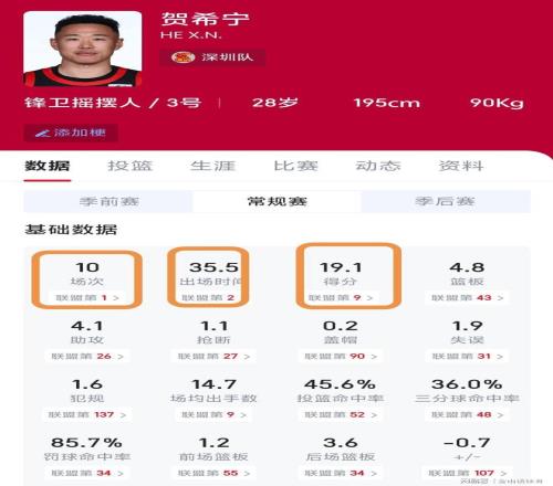 本赛季,贺希宁迎来自己生涯的巅峰期。截止目前,贺希宁场均出战35.5分钟,出场时间,位列全联盟第2位。40分钟比赛打了近36分钟,也就是说,贺希宁每场比赛只休息了4分钟,几乎是打满全场。而他场均19.1分,位列全联盟第9,排在本土球员第2位。